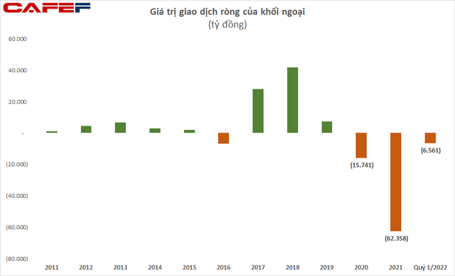 Giao dịch khối ngoại tiếp tục là điểm trừ cho thị trường khi họ bán ròng 6.561 tỷ đồng trong quý 1/2022, song đã có dấu hiệu khả quan khi giảm gần 63% so với giá trị bán ròng trong cùng kỳ năm trước.