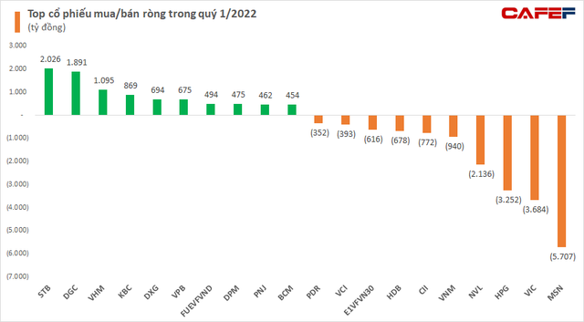 Trong khi đó, cổ phiếu ngân hàng STB đón dòng vốn ngoại quay lại trong những tháng đầu năm 2022, tổng giá trị mua ròng trong quý 1 vượt mức 2.000 tỷ đồng. Song song với đó, cổ phiếu ngành hóa chất DGC hay bluechips dòng bất động sản VHM cũng ghi nhận khối ngoại rót ròng nghìn tỷ đồng.