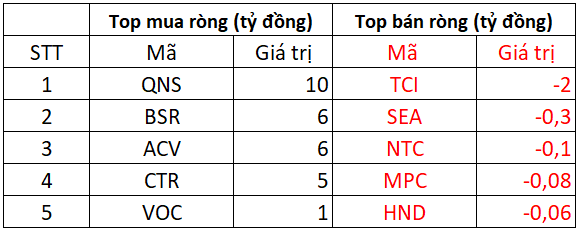Cổ phiếu QNS hôm nay được khối ngoại mua ròng 10 tỷ đồng, ngoài ra BSR và ACV cũng được mua ròng mỗi cổ phiếu khoảng 5 tỷ đồng, những cổ phiếu được mua ròng trên 1 tỷ đồng còn có CTR, VOC, QTP.