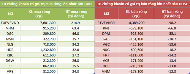 Khối ngoại vẫn mua ròng mạnh chứng chỉ quỹ ETF nội FUEVFVND với 215 tỷ đồng. VHM và DGC được mua ròng lần lượt 63 tỷ đồng và 47 tỷ đồng. Trong khi đó, chứng chỉ quỹ E1VFVN30 bị bán ròng mạnh nhất với 98 tỷ đồng. PNJ và DPM bị bán ròng lần lượt 67 tỷ đồng và 55 tỷ đồng.