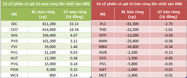 IDC đứng đầu danh sách mua ròng của khối ngoại sàn HNX với 33 tỷ đồng. CEO và SHS được mua ròng lần lượt 18 tỷ đồng và 4,7 tỷ đồng. Trong khi đó, PLC bị bán ròng mạnh nhất sàn này với 2,8 tỷ đồng. THD đứng sau với giá trị bán ròng là 1 tỷ đồng