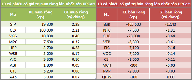 BSR bị khối ngoại sàn UPCoM bán ròng mạnh nhất với 12,4 tỷ đồng, tiếp sau đó, NTC bị bán ròng 1,3 tỷ đồng. Chiều ngược lại, SIP được mua ròng mạnh nhất với 2,3 tỷ đồng. CLX cũng được mua ròng 2,2 tỷ đồng.