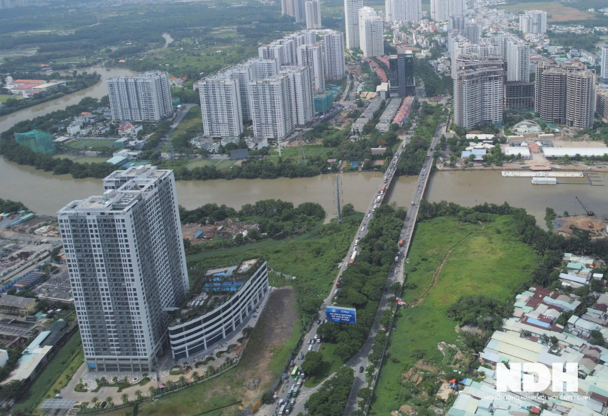 Loạt dự án cao ốc dọc hai bên tuyến Nguyễn Hữu Thọ nhìn từ trên cao.