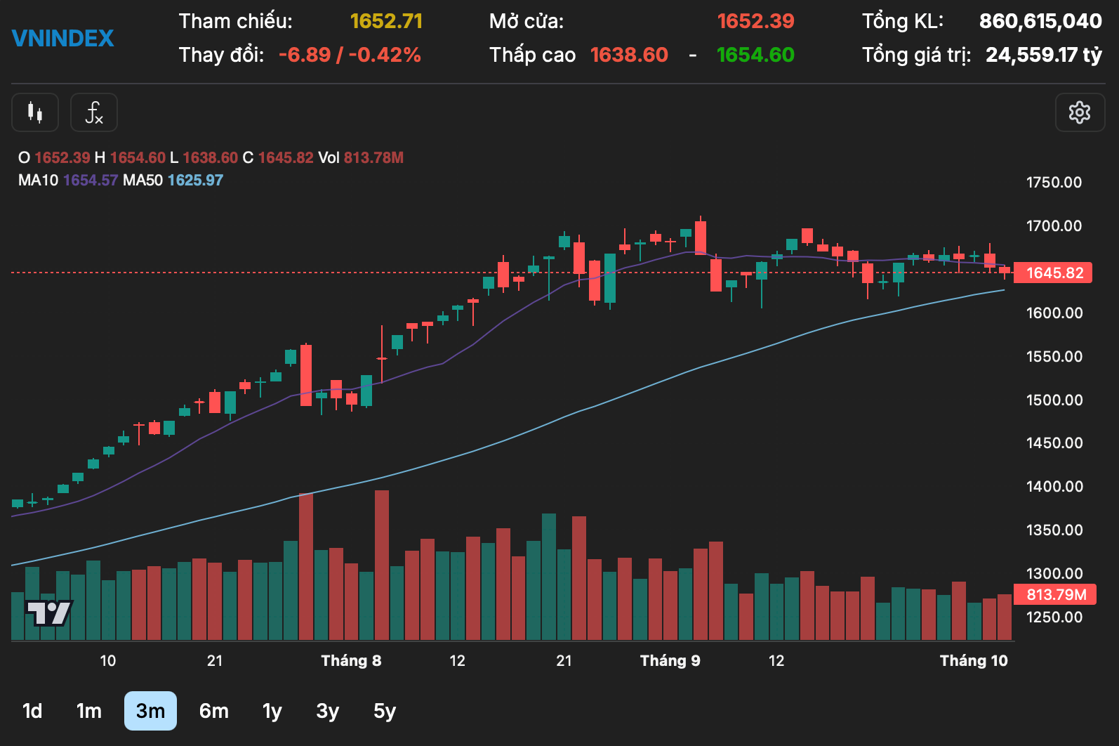 Phiên giao dịch cuối tuần (ngày 3/10), VN-Index diễn ra trong trạng thái giằng co do áp lực bán từ nhóm vốn hóa lớn, mặc dù nỗ lực phục hồi từ lực cầu bắt đáy giúp chỉ số thu hẹp phần nào đà giảm.