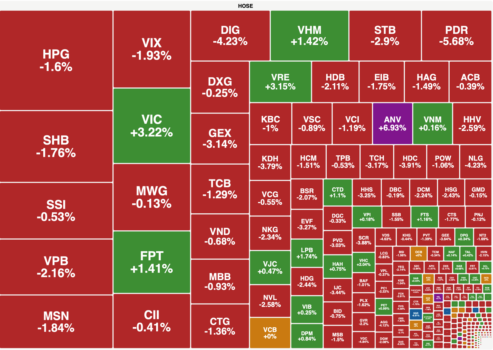 Kết thúc phiên giao dịch, sàn HOSE có 85 mã tăng và 229 mã giảm, VN-Index giảm 6,89 điểm (-0,42%), xuống 1.645,82 điểm. Tổng khối lượng giao dịch đạt hơn 860,6 triệu đơn vị, giá trị đạt 24.559,2 tỷ đồng, tăng hơn 10% về khối lượng và 8% về giá trị so với phiên hôm qua. Giao dịch thỏa thuận đóng góp hơn 35,1 triệu đơn vị, giá trị đạt 1.396 tỷ đồng.