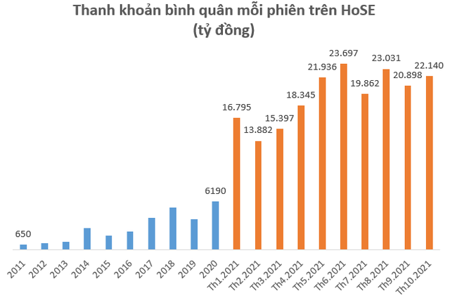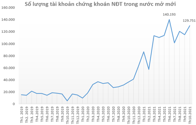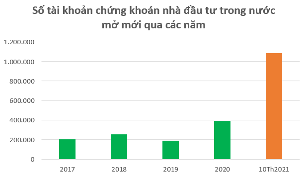 Lũy kế 10 tháng đầu năm, nhà đầu tư trong nước mở mới 1.086.966 tài khoản chứng khoán, lớn hơn tổng số tài khoản mở mới trong 4 năm 2017; 2018; 2019 và 2020 cộng lại (tổng 4 năm đạt 1.043.303 tài khoản).