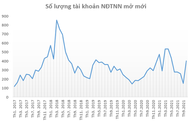 Cũng trong tháng 10, nhà đầu tư nước ngoài đã mở mới 401 tài khoản, tăng 249 tài khoản so với tháng trước và là mức cao nhất trong 5 tháng qua. Lũy kế 10 tháng đầu năm, nhà đầu tư nước ngoài đã mở mới 3.636 tài khoản chứng khoán tại Việt Nam.