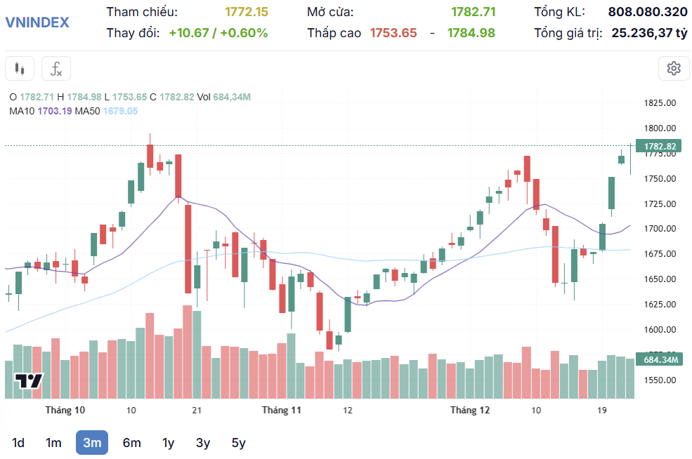 Phiên hôm nay (ngày 24/12), VN-Index kết phiên ở trên mốc 1.780 điểm cho thấy nỗ lực đi lên của thị trường tiếp tục được củng cố, mặc dù đà đi lên đã có sự giảm tốc nhất định.