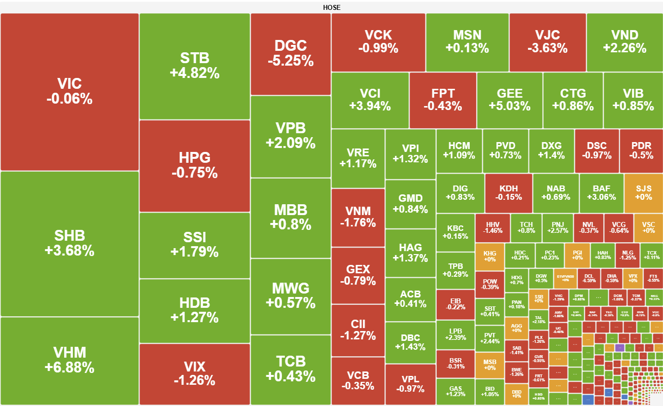 Kết thúc phiên giao dịch, sàn HOSE có 144 mã tăng và 169 mã giảm, VN-Index tăng 10,67 điểm (+0,6%), lên 1.782,82 điểm. Tổng khối lượng giao dịch đạt hơn 808 triệu đơn vị, giá trị đạt 25.236 tỷ đồng, giảm 6% về khối lượng và 3,7% về giá trị so với phiên hôm qua. Giao dịch thỏa thuận đóng góp hơn 123,7 triệu đơn vị, giá trị đạt 4.316,2 tỷ đồng.