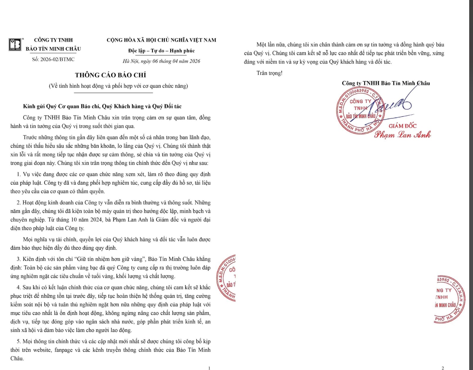 Ngày 6/4, ngay sau thông tin từ Bộ Công an, Công ty TNHH Bảo Tín Minh Châu đã phát đi thông báo chính thức về hoạt động của doanh nghiệp. Theo đó, công ty cho biết đang phối hợp nghiêm túc với cơ quan chức năng, cung cấp đầy đủ hồ sơ, tài liệu theo yêu cầu. Hoạt động kinh doanh hiện vẫn diễn ra bình thường và thông suốt.