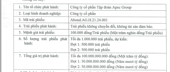 Tìm hiểu các thông tin về trái phiếu APEC, được biết, Hội đồng quản trị Công ty ban hành Nghị quyết ngày 31/12/2020 về việc dự kiến phát hành các gói trái phiếu riêng lẻ với tổng mệnh giá tối đa là 400 tỷ đồng. Trong đó, gói trái phiếu Abond.AG.H.21.24.001 là 1 triệu trái phiếu, tổng giá trị phát hành dự kiến khoảng 100 tỷ đồng.