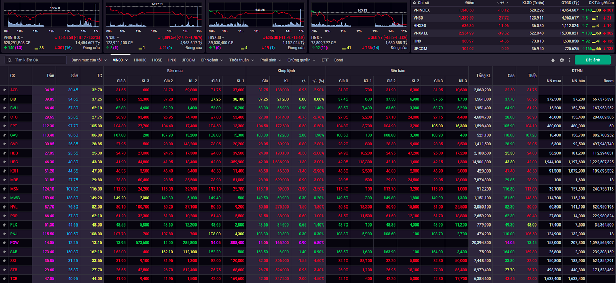 Lực bán mạnh xuất hiện trong phiên chiều chủ yếu đến từ nhóm vốn hóa lớn. Nhiều cổ phiếu trong nhóm VN30 mất giá trên 3% như: TPB, SSI, TCB, STB, VRE, MBB, HPG. Ngược dòng thị trường, cổ phiếu POW tăng tới 6,8% lên giá trần. Bộ ba GAS, BVH, PLX tăng trên 1%. Kết thúc phiên giao dịch đầu tiên của tháng 5, VN30-Index đóng cửa ở mức thấp nhất ngày 1.389,59 điểm, giảm 27,72 điểm (-1,96%) với 21 mã giảm, trong khi chỉ có 8 mã tăng.