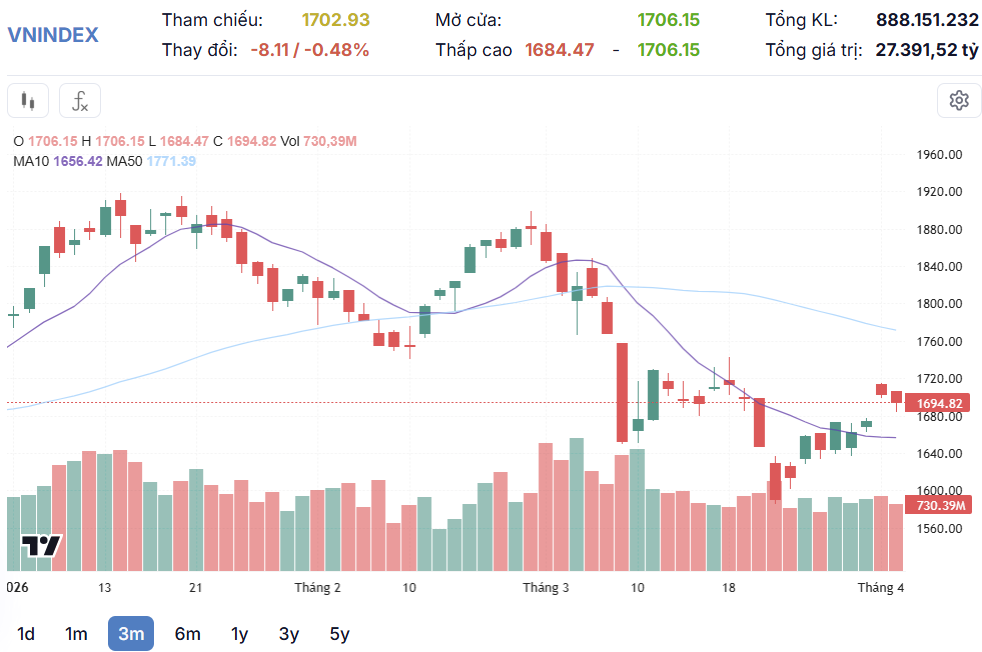 Thị trường mở cửa phiên sáng 2/4 trong trạng thái thận trọng với mức giảm nhẹ 4 điểm. Áp lực điều chỉnh hiện diện rõ rệt tại nhóm cổ phiếu vốn hóa lớn như MWG, MSN, HPG và một số mã ngân hàng. Trong bối cảnh đó, nhóm cổ phiếu họ Vingroup đóng vai trò là “công thần” giúp kìm hãm đà rơi của chỉ số chung. Diễn biến lình xình dưới tham chiếu kéo dài xuyên suốt phiên sáng khi tâm lý nhà đầu tư chịu tác động từ đà bán ròng của khối ngoại.