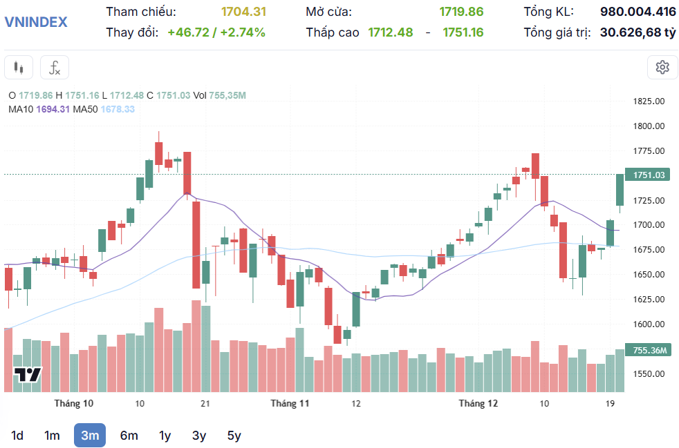 Phiên đầu tuần (ngày 22/12), VN-Index có phiên giao dịch thăng hoa và đóng cửa ở mức cao nhất trong 1.750 điểm. Sự cộng hưởng từ nhóm Vingroup và đà bùng nổ của nhóm ngân hàng đã tạo bệ phóng vững chắc, kéo theo dòng tiền lan tỏa.