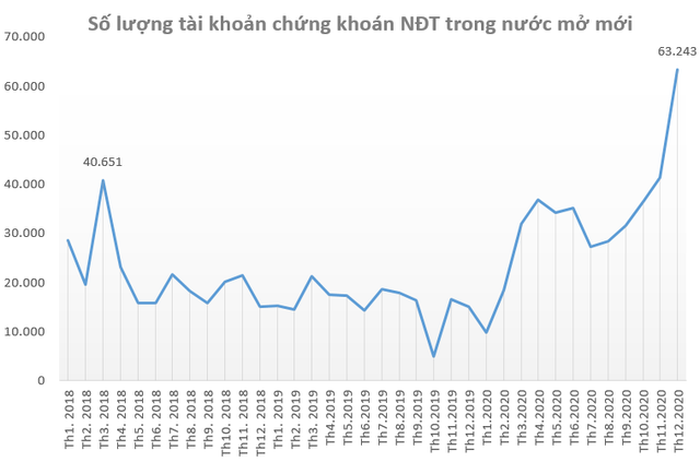 Diễn biến tích cực của thị trường trong những tháng qua có vai trò không nhỏ từ các nhà đầu tư mới, hay gọi là nhà đầu tư “F0”. Số liệu từ VSD cho biết trong năm 2020 có tới hơn 390.000 tài khoản chứng khoán được nhà đầu tư trong nước mở mới, tăng 109% so với năm trước.