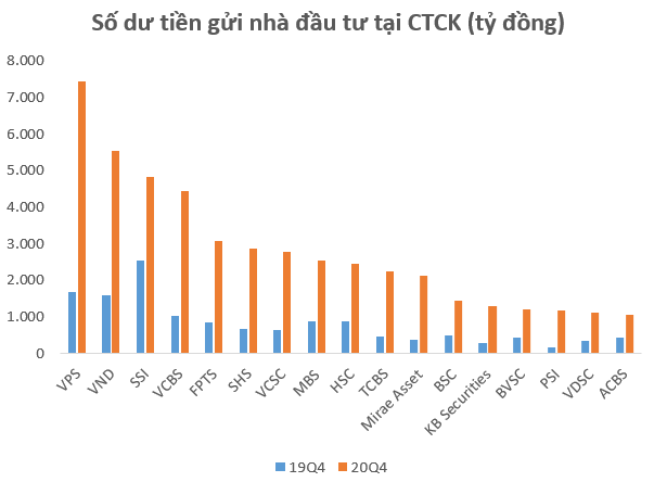 Số liệu từ các CTCK cho biết vào cuối năm 2020, số dư tiền gửi của khách hàng tại các CTCK vào khoảng 60.000 tỷ đồng, gấp 3 lần so với thời điểm đầu năm và đây là con số kỷ lục trong lịch sử. Trong đó chủ yếu là tiền gửi của nhà đầu tư giao dịch chứng khoán theo phương thức CTCK quản lý. Đây là lượng tiền đang nằm sẵn trong tài khoản nhà đầu tư và chưa thực hiện giải ngân vào thời điểm 31/12/2020.