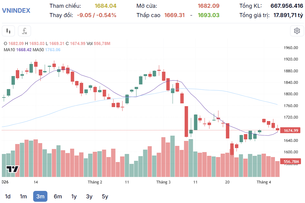 Kết thúc phiên giao dịch hôm nay, sàn HOSE có 76 mã tăng và 238 mã giảm, VN-Index giảm 9,05 điểm (-0,54%), xuống 1.674,99 điểm. Tổng khối lượng giao dịch đạt hơn triệu đơn vị, giá trị đạt 17.892 tỷ đồng, giảm 14% về khối lượng và 15% về giá trị so với phiên cuối tuần trước (ngày 3/4). Giao dịch thỏa thuận đóng góp 111,2 triệu đơn vị, giá trị 3.386 tỷ đồng.