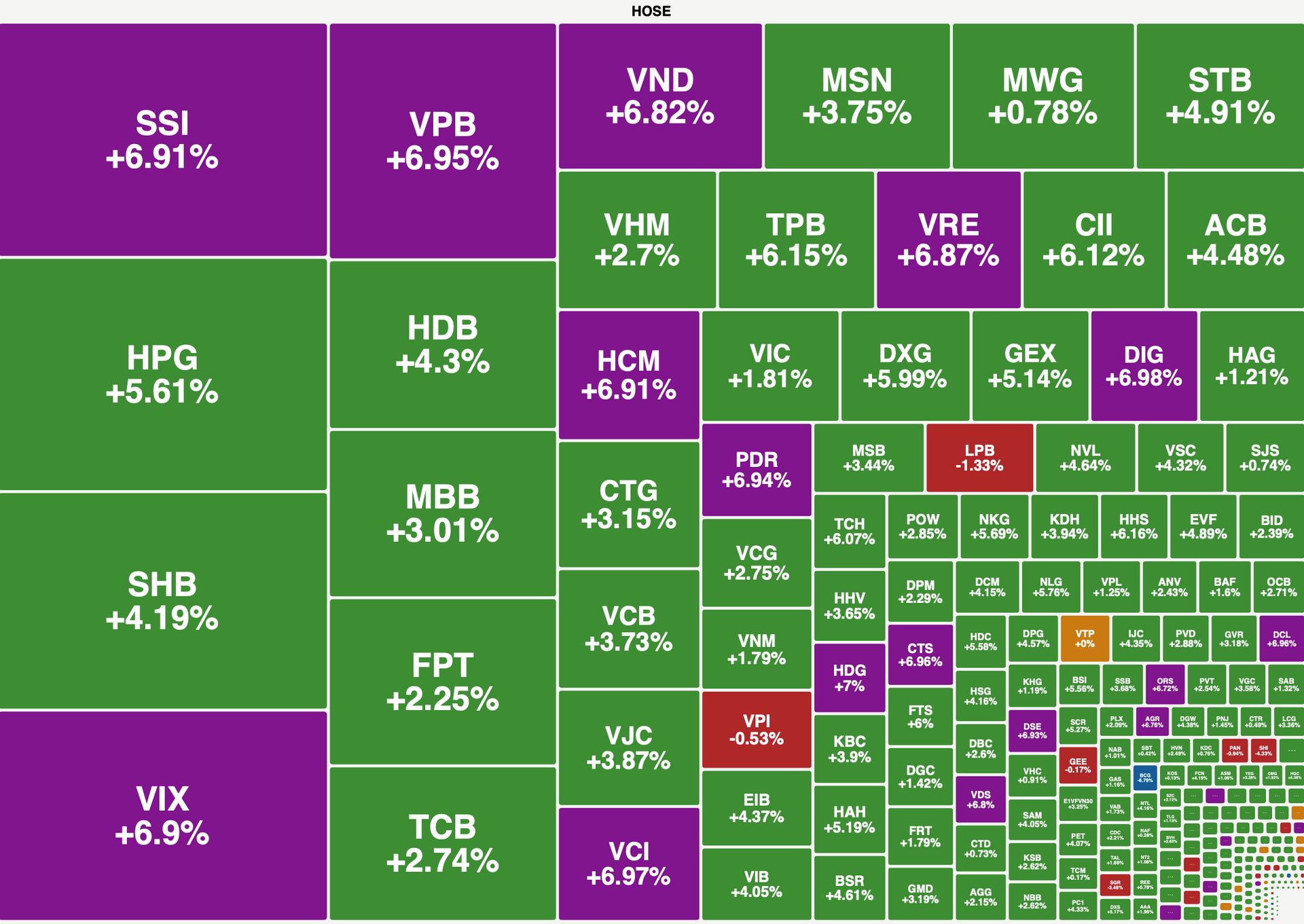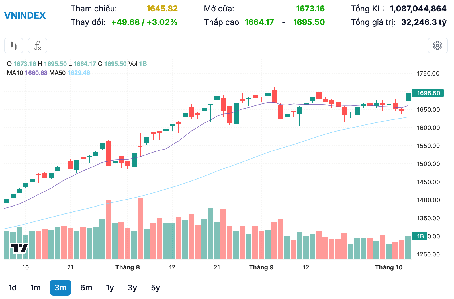 Đóng cửa, sàn HOSE có 259 mã tăng (22 mã tăng trần) và 68 mã giảm, VN-Index tăng 49,68 điểm (+3,02%) lên 1.695,5 điểm. Tổng khối lượng giao dịch đạt 1,08 tỷ đơn vị, giá trị đạt 31.784 tỷ đồng, tăng 25,6% về khối lượng và 29,4% về giá trị so với phiên cuối tuần trước (ngày 3/10). Giao dịch thỏa thuận đóng góp hơn 82,2 triệu đơn vị, giá trị đạt 2.730,2 tỷ đồng.
