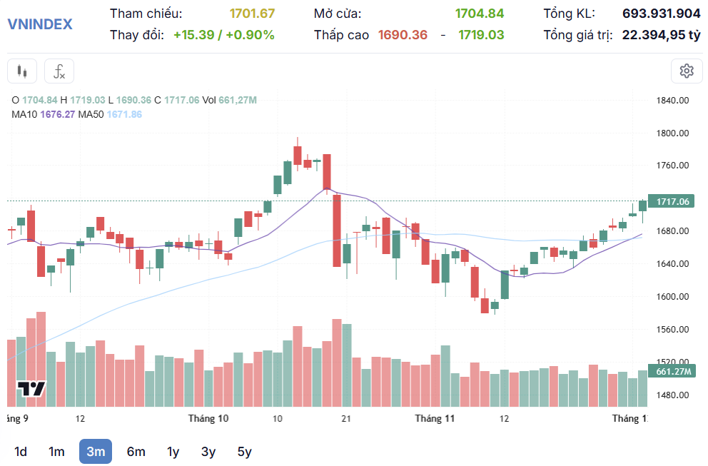 VN-Index tiếp tục nối tiếp quán tính tăng điểm và kết phiên hôm nay tiệm cận mốc 1.720. Đáng chú ý là sắc xanh và lực cầu đã có tín hiệu tham gia tích cực hơn khi dòng tiền mua chủ động tham gia khá tốt ở một số nhóm ngành trên thị trường.