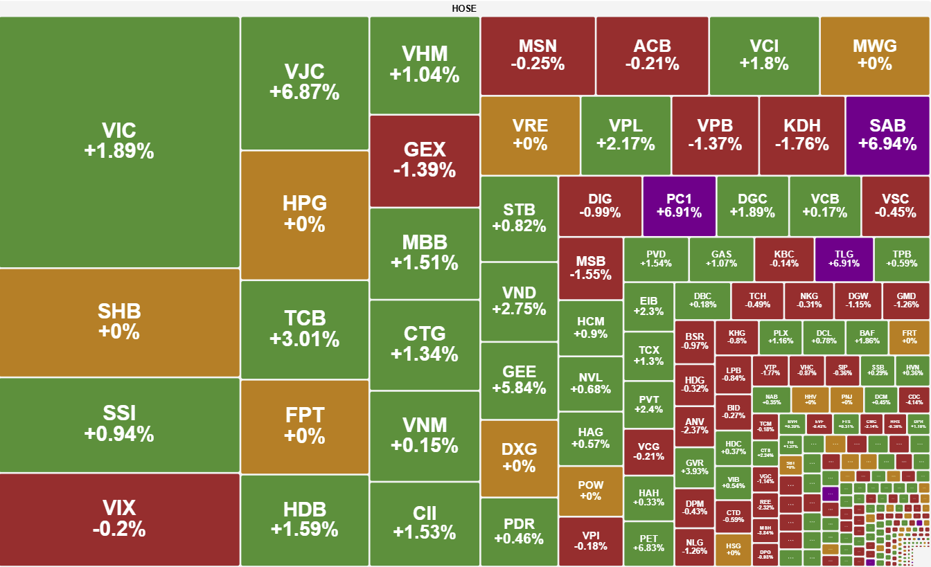 Tuy nhiên, kịch bản thị trường đã thay đổi hoàn toàn vào phiên chiều. Lực cầu gia tăng trở lại cùng nỗ lực giữ nhịp của các mã vốn hóa lớn (VIC, SAB, VJC, GEE) đã giúp VN-Index thu hẹp đà giảm và thực hiện cú đảo chiều ấn tượng, tiến lên sát mốc 1.720 điểm.
