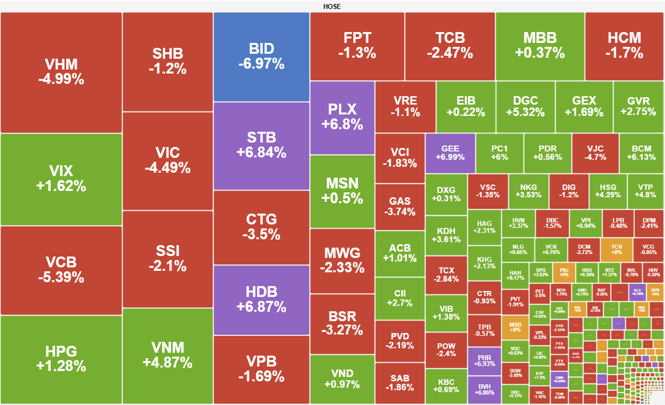 Bước sang phiên chiều, thị trường tiếp tục chịu thử thách khi các “trụ” lớn như VCB, BID, CTG bị bán mạnh. Dẫu vậy, dòng tiền không rời bỏ thị trường mà luân chuyển sang các mã riêng lẻ, giúp STB và HDB bứt phá tăng trần, cùng sự hỗ trợ từ HPG. Sự kiên trì của các mã VNM, GVR, PLX đã giúp chỉ số thu hẹp một phần đà giảm. Trong bối cảnh là phiên đáo hạn phái sinh VN30, những nhịp rung lắc biên độ rộng là điều khó tránh khỏi, nhưng nỗ lực giữ nhịp của dòng tiền nội vẫn là điểm tựa đáng ghi nhận.