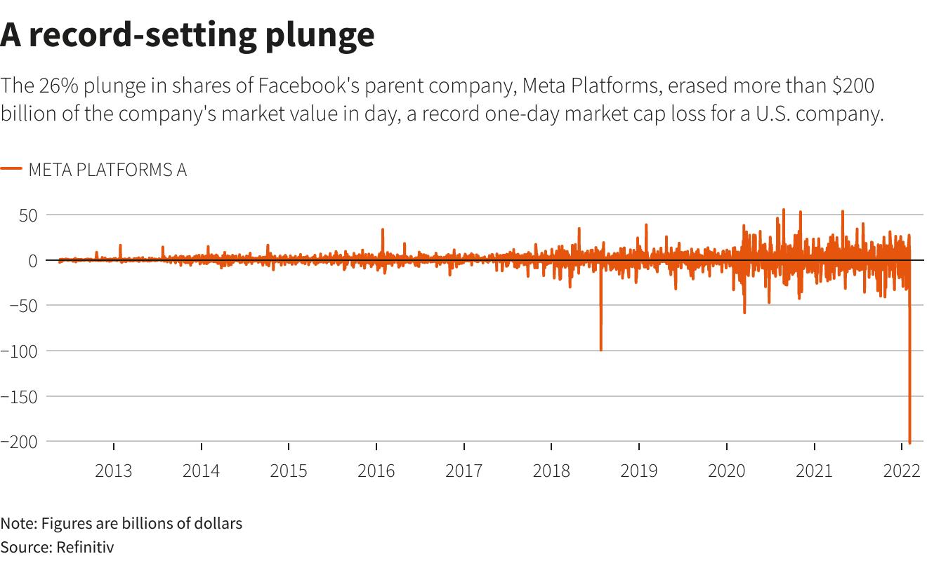 Theo dữ liệu của Reuters, cổ phiếu của Meta đã giảm 26,4%, làm bốc hơi khoảng hơn 200 tỷ USD vốn hóa trên thị trường, với lý do hãng đổ lỗi cho những thay đổi về quyền riêng tư của Apple và sự cạnh tranh gia tăng từ các đối thủ như TikTok gây ra triển vọng đáng thất vọng.