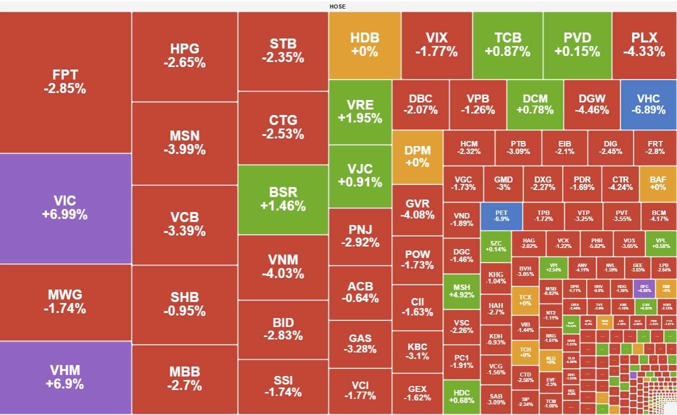Bước sang phiên chiều, diễn biến thị trường trở nên sôi động hơn khi dòng tiền cuộn chảy mạnh mẽ vào nhóm Vingroup, đẩy cả VHM và VIC vươn tới mức giá trần kịch trần. Sự bùng nổ này đã có lúc kéo chỉ số chung lội ngược dòng thành công, giành lại sắc xanh trong sự phấn khởi của phe mua. Tuy nhiên, kịch bản bất ngờ xảy ra vào những phút cuối phiên khi áp lực bán chủ động bất ngờ gia tăng đột biến. Trước sức ép xả hàng quá lớn tại nhiều nhóm ngành, nỗ lực của bộ đôi Vingroup trở nên đơn độc, khiến VN-Index một lần nữa đảo chiều giảm điểm khi đóng cửa.