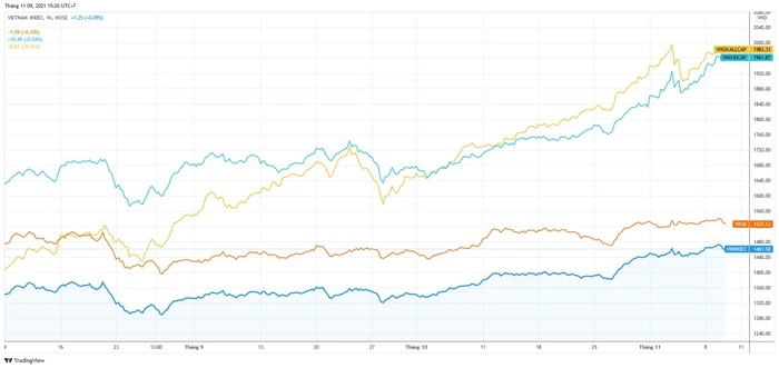 Nhìn lại 3 tháng qua, chỉ số VN30-Index gần như đi ngang nhưng chỉ số VNMID-Index và VNSML-Index lại bứt tốc. Điều này có thể dễ dàng thấy được khi nhìn vào khoảng giữa 8/2021, chỉ số VN30-Index và VNSML-Index bằng điểm nhau nhưng đến phiên 9/11, chỉ số VN30-Index chỉ ở mức 1.527,13 điểm còn VNSML-Index đã lên đến 1.961,87 điểm.