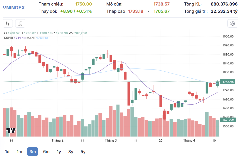 Kết thúc phiên giao dịch, sàn HOSE có 137 mã tăng và 171 mã giảm, VN-Index tăng 8,96 điểm (+0,51%), lên 1.758,96 điểm. Tổng khối lượng giao dịch đạt 880,4 triệu đơn vị, giá trị đạt 22.532 tỷ đồng, cùng giảm khoảng 8,5% cả về khối lượng và giá trị so với phiên cuối tuần trước. Giao dịch thỏa thuận đóng góp hơn 113,1 triệu đơn vị, giá trị đạt 2.975,9 tỷ đồng.