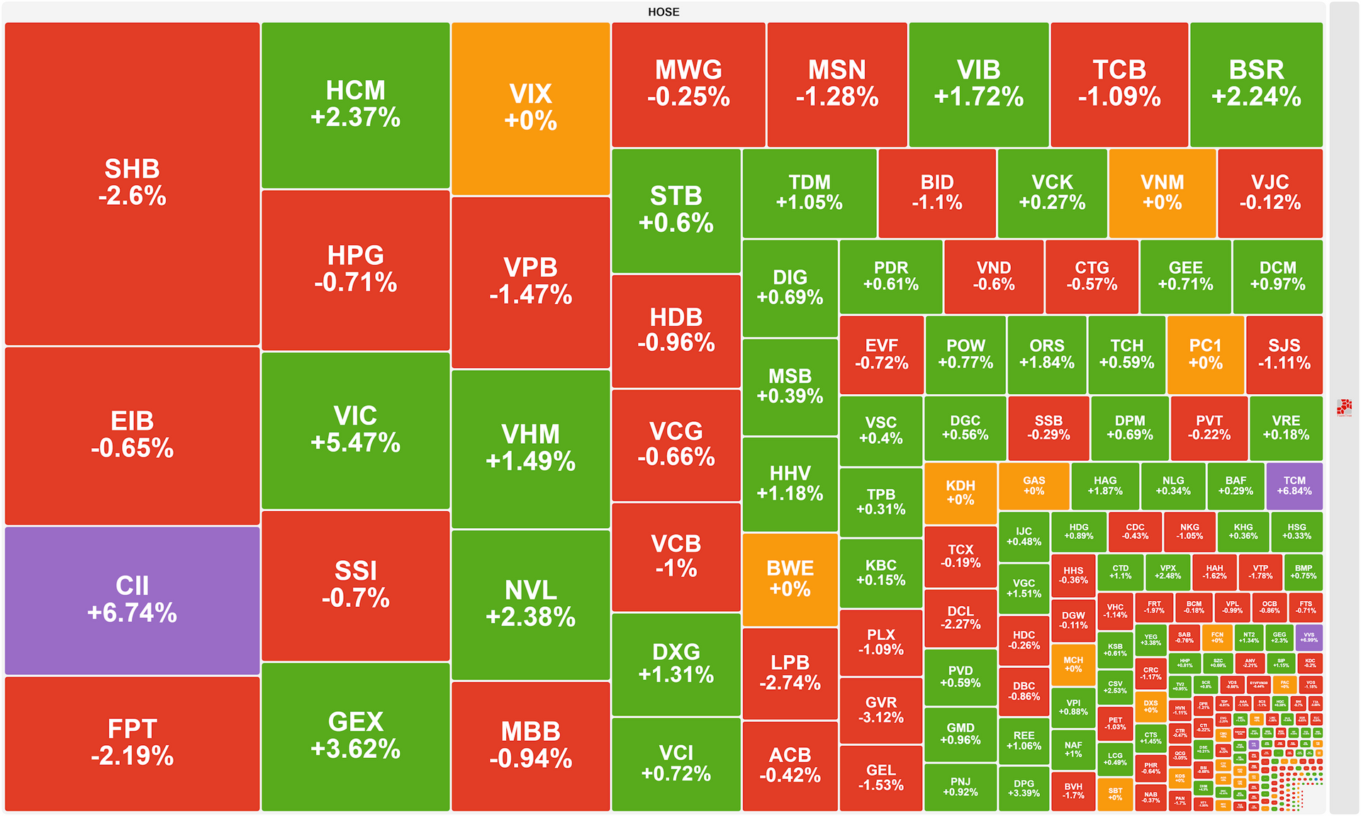 Động lực chính dẫn dắt đà tăng gọi tên bộ đôi nhà Vingroup là VIC và VHM. Mức tăng ấn tượng của hai mã này không chỉ đóng góp lớn vào điểm số mà còn lan tỏa hiệu ứng tích cực sang các cổ phiếu khác như CII, GEX và BSR. Sắc xanh được củng cố vững chắc xuyên suốt thời gian còn lại của phiên giao dịch.