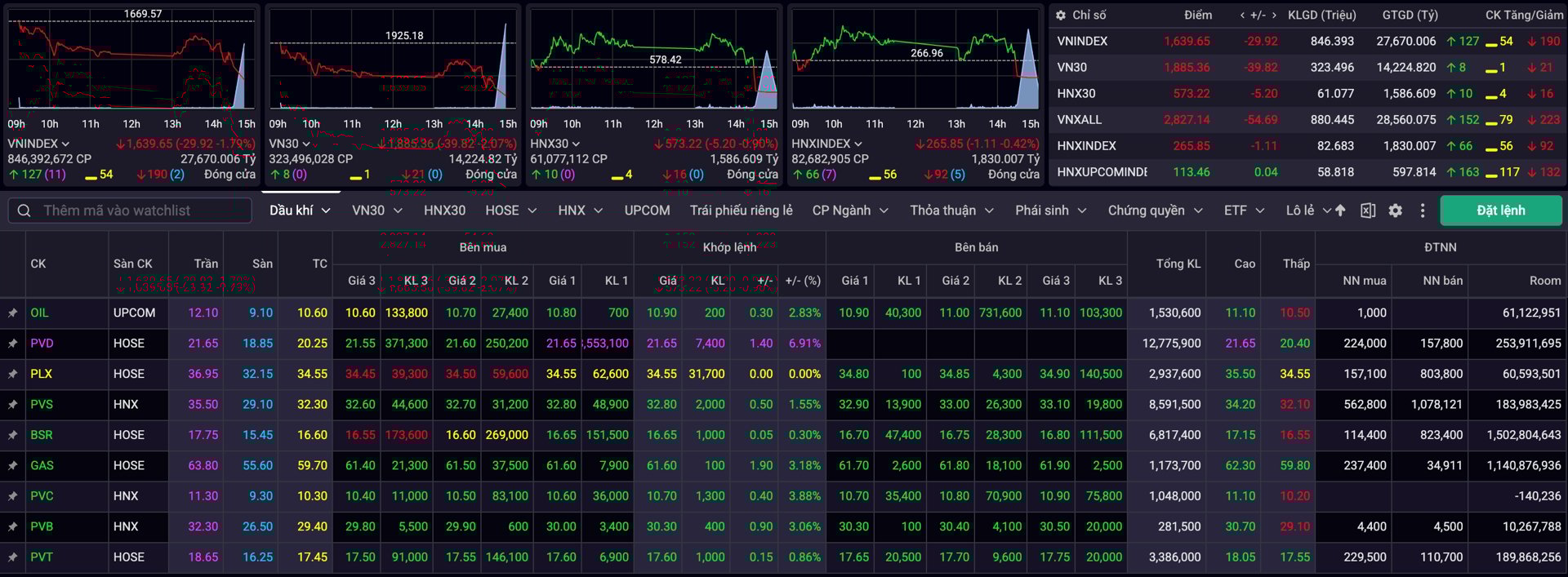 Sắc đỏ chiếm ưu thế trên cả HoSE lẫn HNX. Cụ thể, sàn HoSE ghi nhận 190 mã giảm, 127 mã tăng và 54 mã đứng giá, trong khi HNX có 94 mã giảm, 67 mã tăng, 58 mã tham chiếu. Độ rộng trên UPCoM có phần cân bằng hơn với 154 mã giảm và 155 mã tăng.