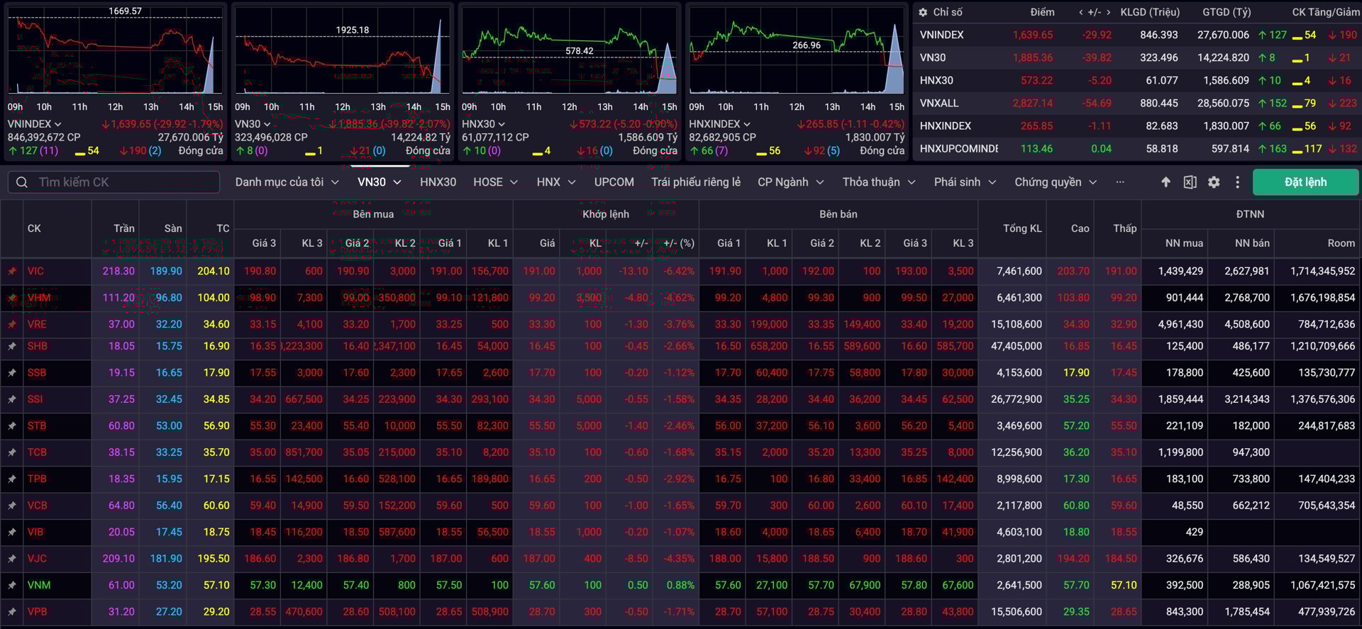 Áp lực bán liên tục lan rộng ở nhóm vốn hóa lớn về cuối phiên đã kéo thị trường giảm sâu, với VN30 mất gần 30 điểm. Trong đó, VIC và VHM là hai “tội đồ” lớn nhất khi lần lượt lấy đi 11,22 và 4,42 điểm của VN-Index. Danh sách 10 mã tác động tiêu cực còn có sự góp mặt của bộ đôi hàng không VJC, HVN cùng một loạt cổ phiếu ngân hàng như VCB, HDB, TCB, VPB. Ở chiều ngược lại, GAS là mã tích cực nhất khi mã duy nhất đóng góp hơn 1 điểm vào chiều tăng của thị trường.