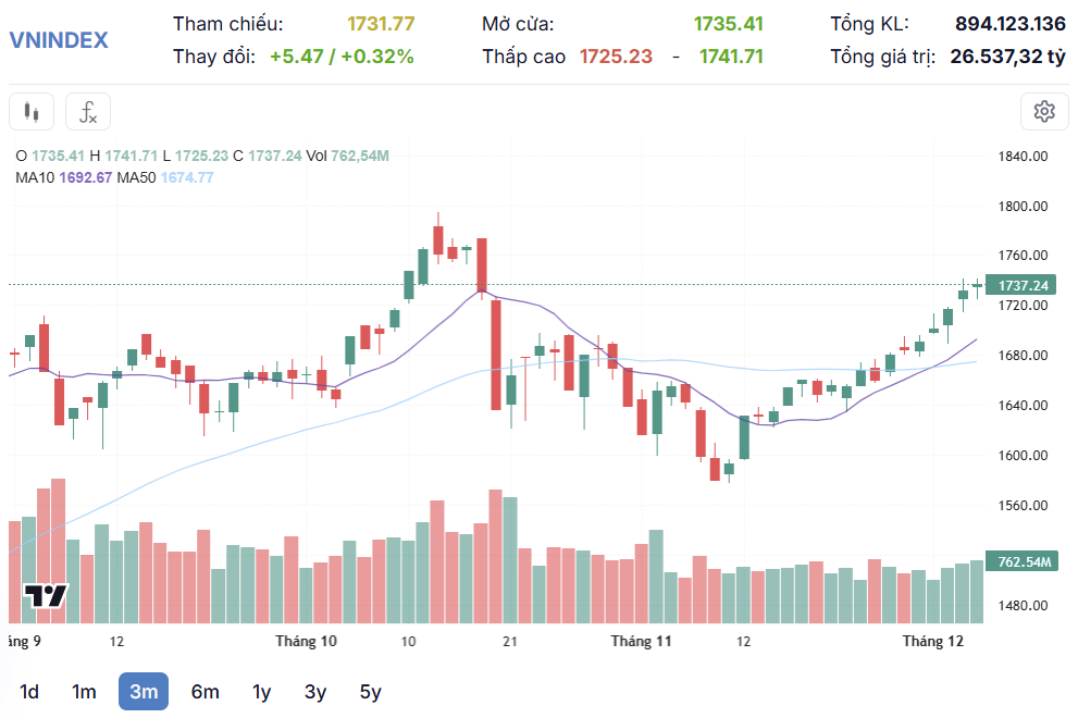 Kết thúc phiên giao dịch, VN-Index tăng 5,47 điểm (+0,32%) lên 1.737,24 điểm với mã 217 tăng và 91 mã giảm. Tổng khối lượng giao dịch đạt 894,1 triệu đơn vị, giá trị đạt 26.537 tỷ đồng, tăng 8,7% về khối lượng nhưng giảm 7,2% về giá trị so với phiên phiên hôm qua. Trong đó, giao dịch thỏa thuận đóng góp 132,2 triệu đơn vị, giá trị đạt 3.917,4 tỷ đồng.