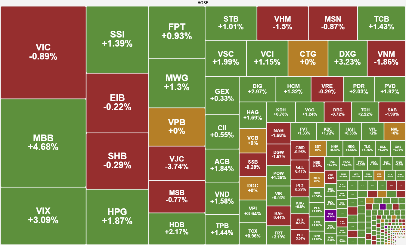 Phiên chiều chứng kiến sự trở lại của lực cầu. Diễn biến nới rộng biên độ tăng ở VPL, MBB và HPG đã giúp VN-Index tạm thời quay lại mốc 1.740. Mặc dù sự phân hóa ở nhóm vốn hóa lớn đã cản trở đà bứt phá và khiến chỉ số quay về 1.730, sắc xanh vẫn được bảo toàn nhờ dòng tiền luân chuyển sang nhóm cổ phiếu vừa và nhỏ như bất động sản, chứng khoán và phân đạm – dầu khí.