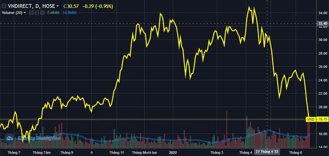 Mức giảm 6,7% phiên hôm nay đưa VND xuống mức thấp nhất kể từ tháng 7 năm 2021. Giá trị vốn hóa thị trường chỉ còn 22.100 tỷ đồng, “bốc hơi” gần một nửa so với thời điểm đạt đỉnh hồi đầu tháng 4. Như vậy, VNDirect – cái tên cuối cùng ngành chứng khoán cũng đã rời khỏi câu lạc bộ tỷ USD vốn hóa. Trước đó, SSI cũng đã “rớt đài” khi cổ phiếu này giảm sàn phiên 15/6.