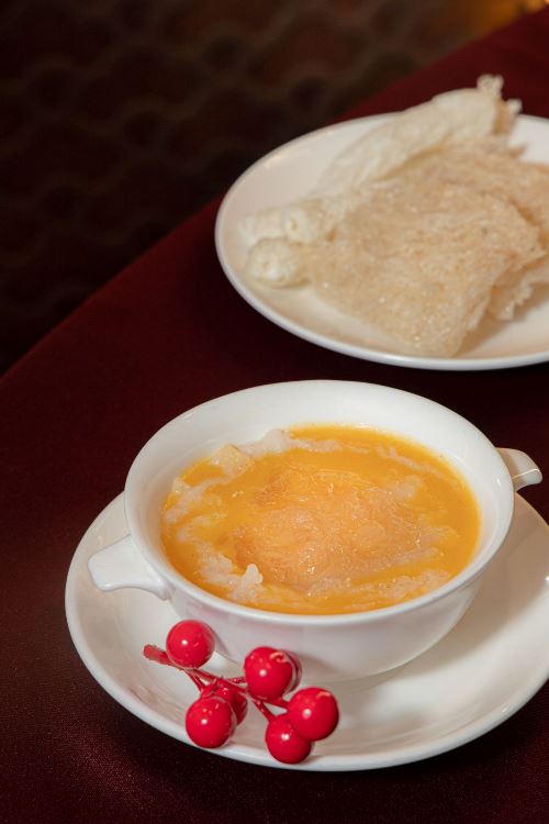 Khai mở bàn tiệc là Gỏi tôm hùm phát tài – món ăn thường xuất hiện trong các buổi tiệc đầu năm, hàm ý may mắn và khởi đầu trọn vẹn. Tôm hùm tươi được chế biển kỹ lưỡng, giữ trọn độ ngọt tự nhiên, kết hợp cùng rau củ thanh mát, tạo nên tổng thể hài hòa cả về hương vị lẫn hình thức. Hành trình thưởng thức nối tiếp với Súp yến sào trúc sanh được chắt lọc từ những nguyên liệu bổ dưỡng, mang hương vị thanh nhẹ. Từng sợi yến trong vắt quyện trong nước dùng sánh mịn, tựa lời hỏi thăm sức khỏe ân cần dành cho các bậc trưởng bối trong thời khắc hội ngộ.