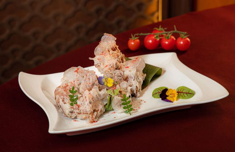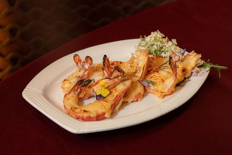 Trải nghiệm ẩm thực được nâng tầm cùng Tôm sú biển phô mai đút lò. Phô mai hảo hạng được đút lò vừa đủ nhiệt, tạo nên lớp phủ vàng ươm, thơm ngậy, quyện chặt vào phần thịt tôm tươi ngọt. Dư vị tinh tế tiếp tục được khẳng định qua món Hàu khô hầm lưỡi heo tóc tiên – tuyệt phẩm mang đậm kỹ thuật hầm chậm kỳ công của người Quảng Đông. Sự cộng hưởng giữa hàu khô mằn mặn, lưỡi heo mềm mọng và tóc tiên dai giòn, mang đến hương vị vừa đậm đà vừa thanh tao. Cả hai món ăn đều khéo léo truyền tải thông điệp gắn kết trong bữa tiệc đầu xuân.