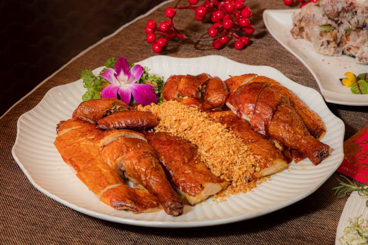 Bộ đôi Gà chiên tỏi Hoàng Kim và Giò heo chiên giòn – tượng trưng cho thịnh vượng viên mãn, nâng tầm bàn tiệc đoàn viên rực rỡ. Lớp da gà chiên vàng óng ánh, dậy hương tỏi phi thơm nồng, giữ trọn độ ngọt tự nhiên và tươi mọng của thịt gà. Mặt khác, mỹ vị tinh tế từ giò heo phản ánh kỹ nghệ xử lý lửa của người đầu bếp, tạo nên món ăn có lớp vỏ ngoài giòn rụm nhưng phần gân và thịt bên trong vẫn giữ được kết cấu mềm dai. Mỗi món ăn lan tỏa lời chúc suôn sẻ và tài lộc dồi dào cho năm mới.