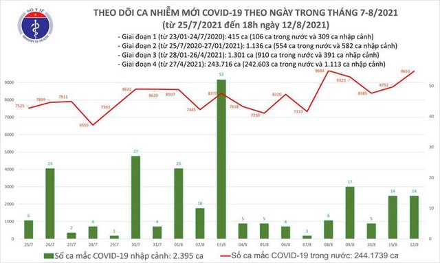 Trong ngày 12/8, Việt Nam ghi nhận 9.667 ca nhiễm mới, trong đó 14 ca nhập cảnh và 9.653 ca ghi nhận trong nước tại 42 tỉnh, thành phố, trong đó có 2.226 ca trong cộng đồng.