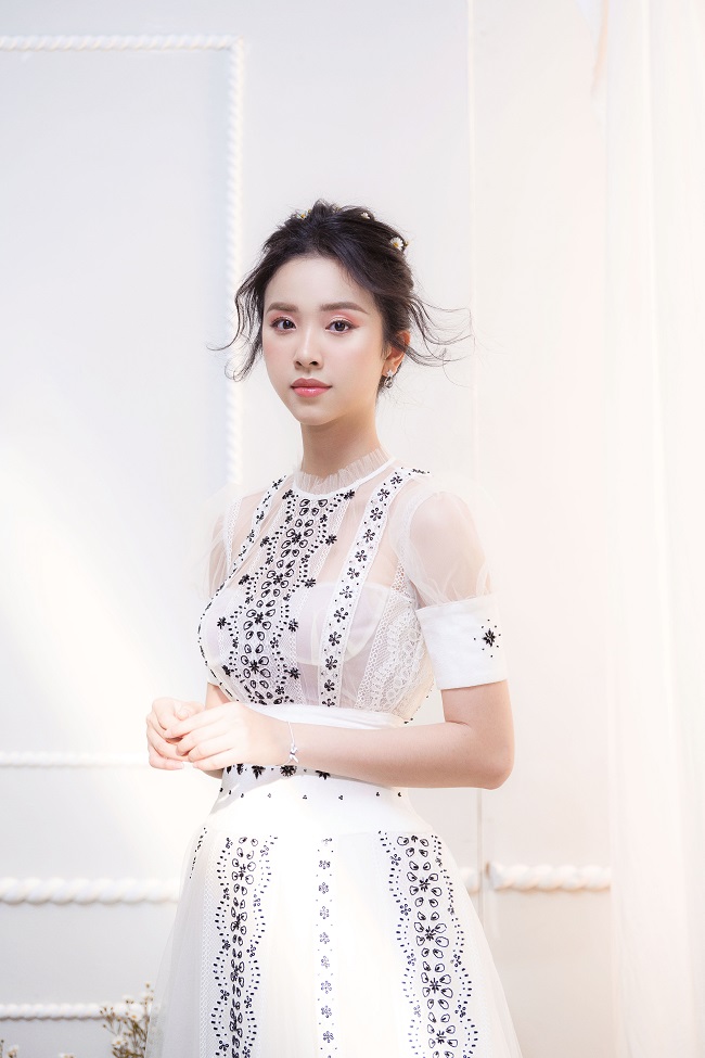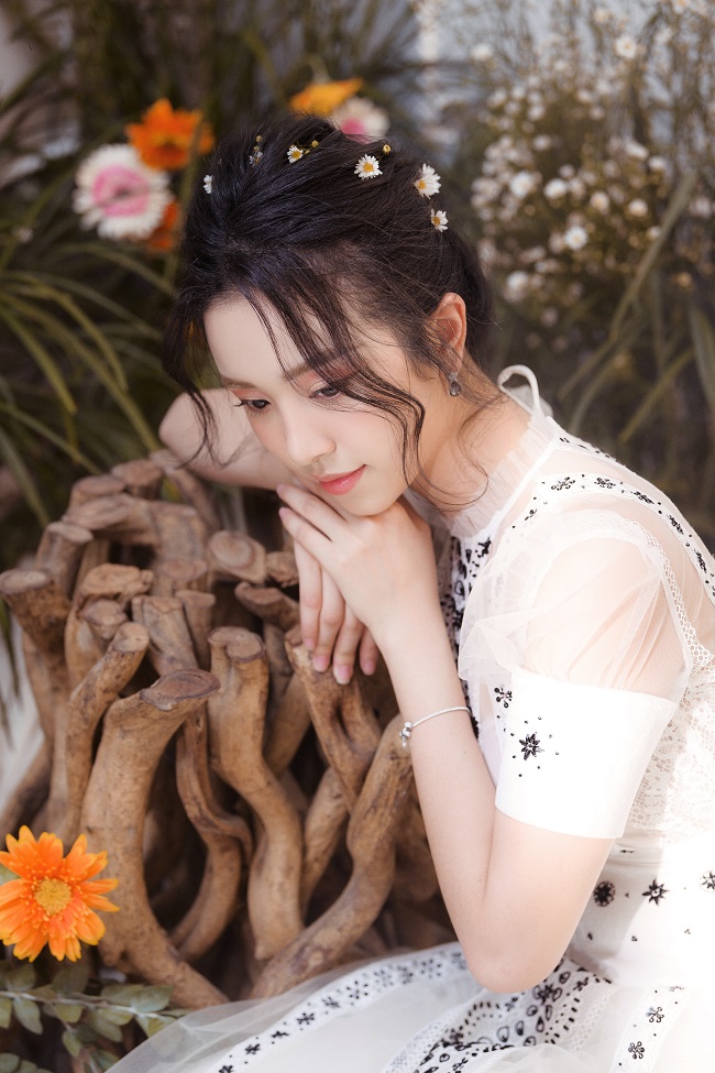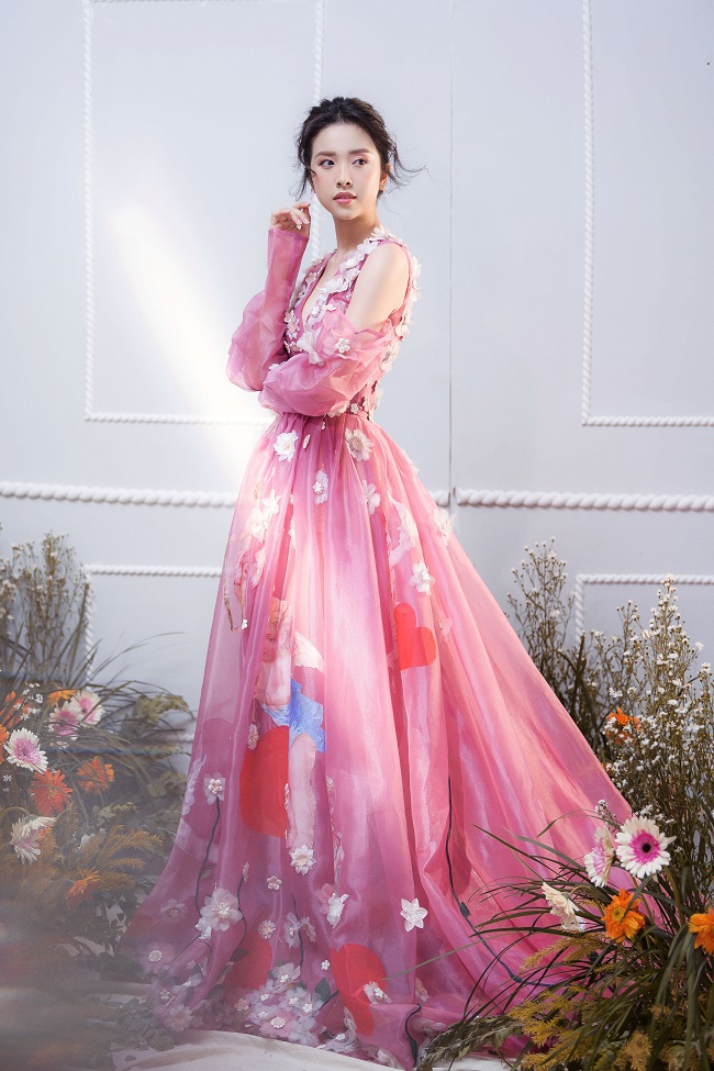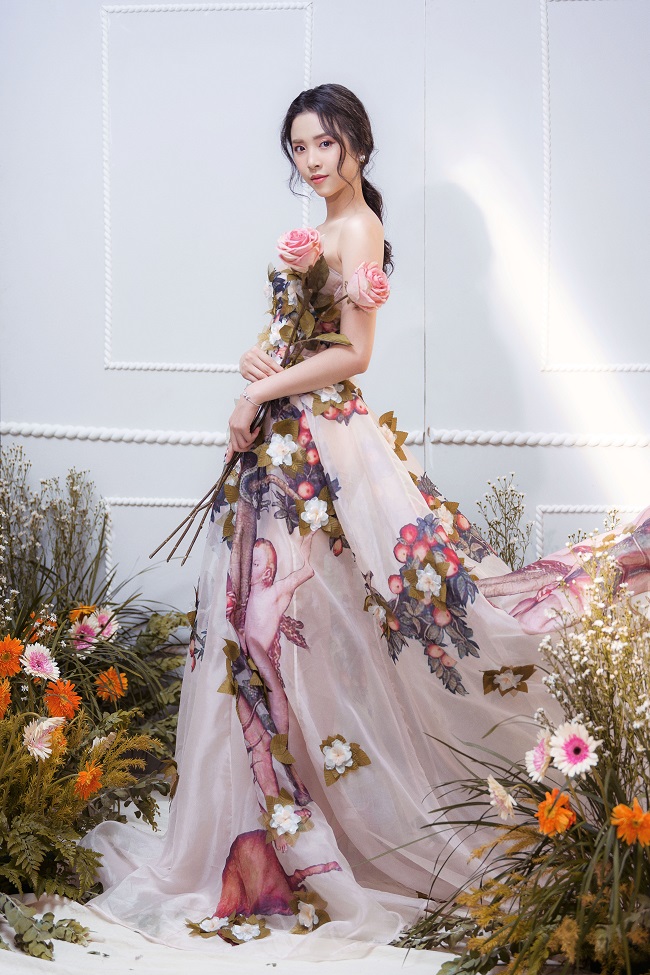 Diện những mẫu đầm công chúa, mang hơi hướng cổ tích, cùng kiểu tóc buông lơi và lối trang điểm nhẹ nhàng, nàng Á hậu thả dáng bên hoa, e ấp khoe nét đẹp “chim sa cá lặn” của mình.