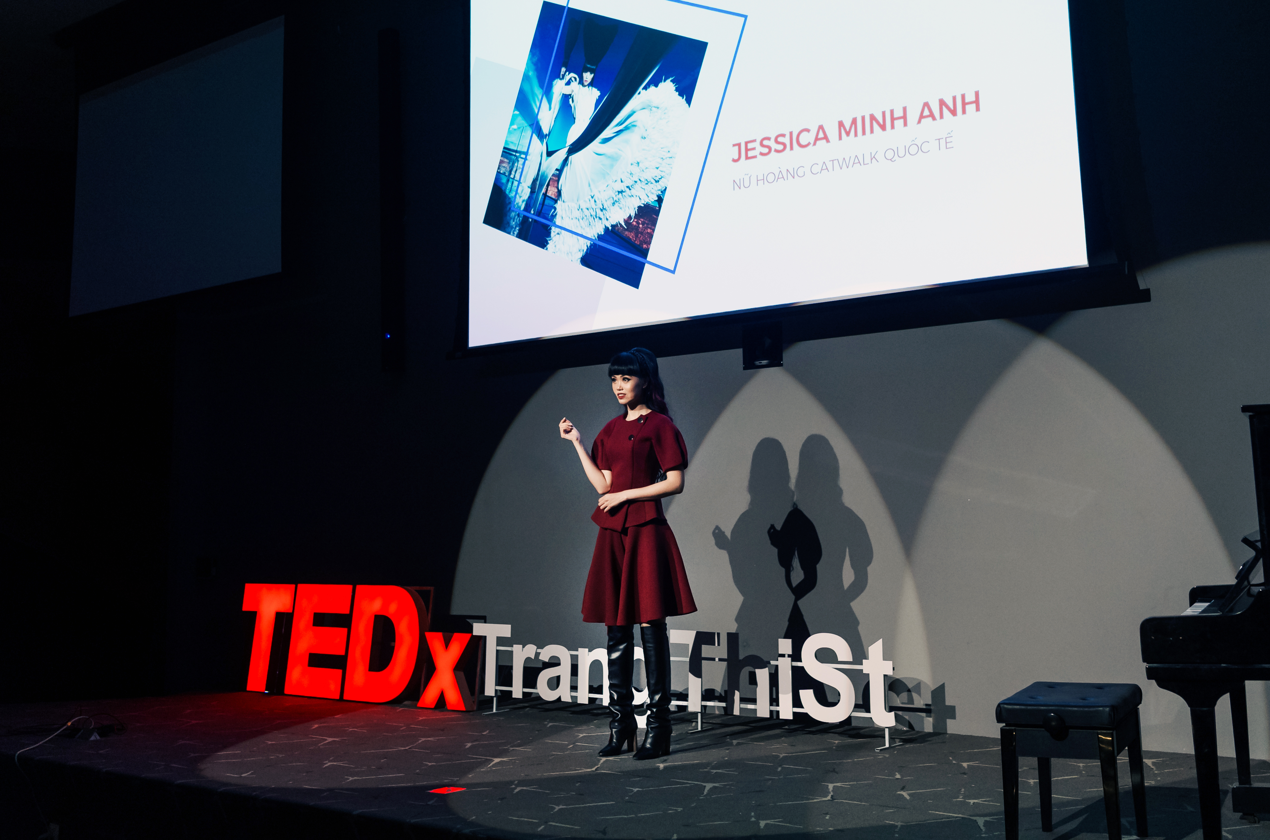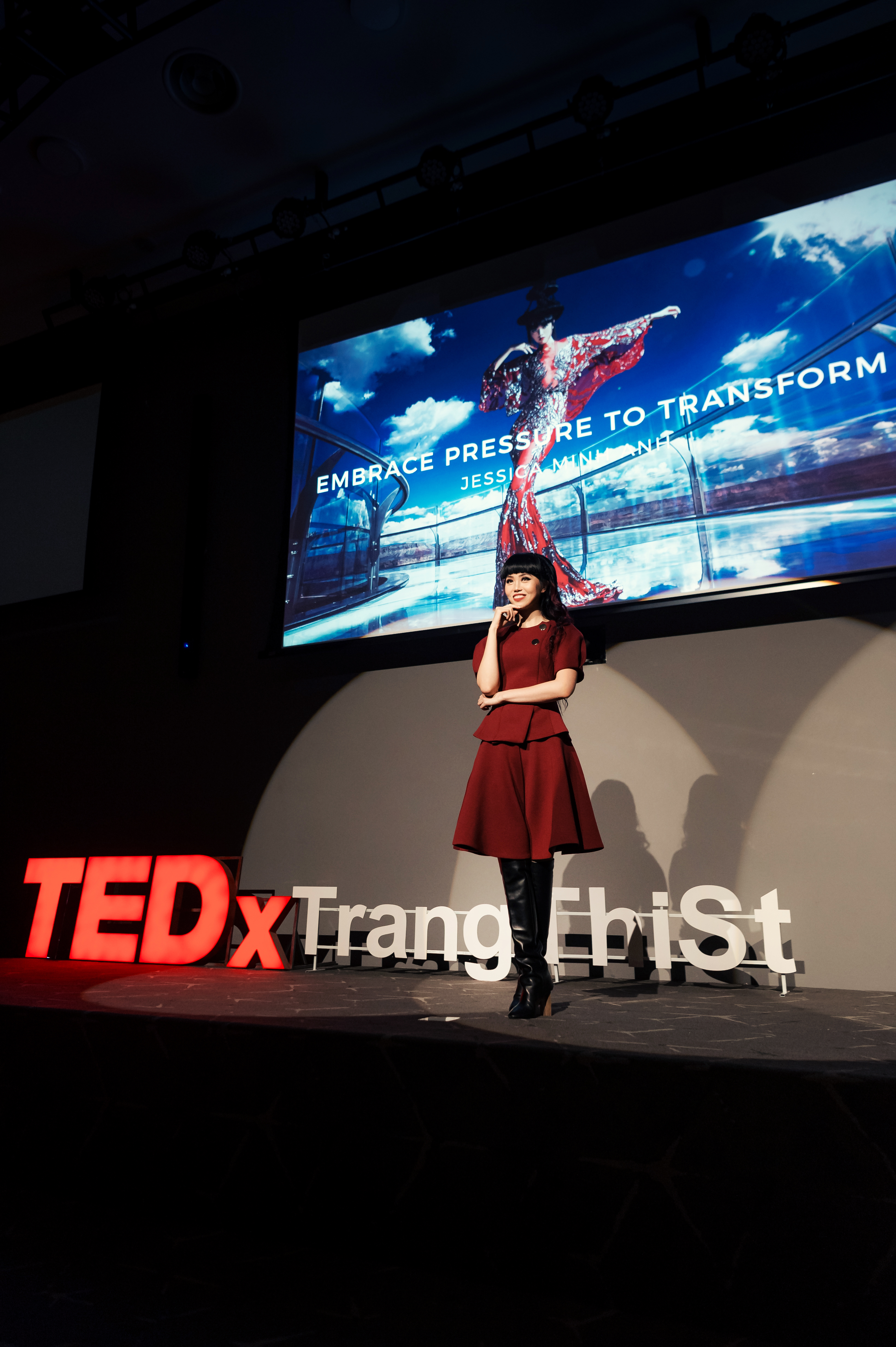 Xuất hiện trong bộ váy áo đỏ nâu rất thời trang nhưng cũng rất lịch sự, Jessica đã truyền kinh nghiệm và các bài học quý giá từ hơn 10 năm làm việc trên 4 châu lục cho các bạn sinh viên bằng tiếng Anh, theo đúng tiêu chuẩn TEDx quốc tế.Trong gần 10 phút trên sân khấu TEDxTrangThiSt, Jessica đã kể về áp lực học tập phổ thông để vào đại học tại Việt Nam, trước khi đỗ thủ khoa ĐH Hà Nội và Á Khoa ĐH Bách Khoa và nhận học bổng toàn phần ra nước ngoài. Cô cũng nói đến nỗi lo tìm việc của sinh viên quốc tế mới ra trường tại Anh trước khi mở công ty riêng và làm việc vòng quanh thế giới.Khán giả đã rất bất ngờ về các khó khăn tưởng như bế tắc của Jessica khi các show diễn ngoài trời của cô gặp phải sự cố giông bão, lụt lội, hạn hán, cũng như cách cô giữ bình tĩnh và giải quyết mọi vấn đề một cách thông mình va dũng cảm. Jessica đã khuyên sinh viên Việt Nam nên tận dụng áp lực để trở thành nguồn động lực trong công việc và cuộc sống, để chứng minh khả năng của mỗi người, và liên tục đổi mới để thích nghi với sự cạnh tranh khốc liệt trong nhiều ngành.Cô cũng đề cập đến tầm quan trọng của việc xây dựng một đội ngũ nhân viên và đồng nghiệp chuyên nghiệp. Kết thúc diễn đàn truyền cảm hứng quốc tế TEDx, Jessica nhắn nhủ giới trẻ “Tôi sẽ không đứng đây để nói với các bạn rằng tôi tự tin nắm chắc phần thắng trong mọi việc, vì tôi không biết chính xác tương lai sẽ như thế nào. Nhưng có một điều tôi chắc chắn, rằng mỗi người đều có một sức mạnh tiềm ẩn để có thể vượt qua mọi áp lực và khó khăn trong cuộc sống. Chúng ta ai cũng có sự lựa chọn cách chúng ta đối mặt với những áp lực và khó khăn đấy, bị stress và tiêu cực, hay tự tin và phấn chấn”.Jessica Minh Anh đại diện cho thế hệ trẻ dám nghĩ dám làm không chỉ tại Việt Nam mà trên toàn thế giới. Cô hiện đang hợp tác với một số tổ chức phi chính phủ để truyền động lực cho giới trẻ toàn cầu, đặc biệt là phụ nữ. Nhân dịp Tết Nguyên Đán năm nay, Jessica sẽ góp mặt vào một số chương trình đặc biệt trên VTV và HTV. Người yêu thời trang Việt Nam có thể thấy Jessica trên đường phố Hà Nội và Sài Gòn trong các bộ trang phục lộng lẫy của Đỗ Mạnh Cường, Lê Thanh Hoà, Hà Linh Thư, Thuỷ Nguyễn, v.v. cũng như phong cách thời trang đầy cá tính. Jessica cũng là khách mời đặc biệt của các đại sứ như Anh, Hàn Quốc, Áo, Thổ Nhĩ Kỳ, v.v. trong các sự kiện tại Hà Nội.Jessica dự kiến sẽ tổ chức một show diễn tại Việt Nam để quảng bá vẻ đẹp của quê hương ra thế giới. Địa điểm bí mật này sẽ được bật mí trước show diễn 2 tháng.