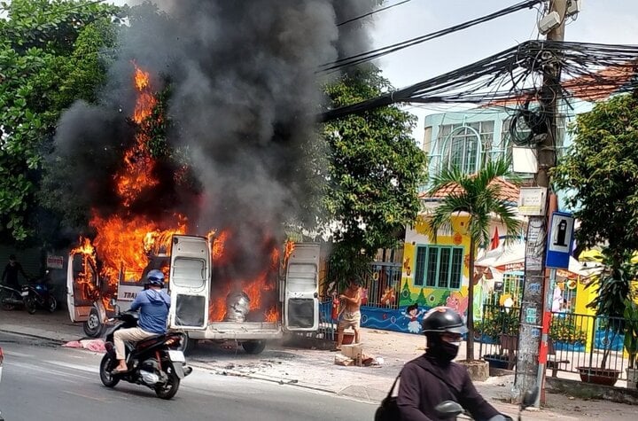 Ô tô 16 chỗ đang di chuyển trên đường ở TP Thủ Đức, TP.HCM thì bốc cháy dữ dội khiến giao thông qua khu vực bị ùn tắc kéo dài.